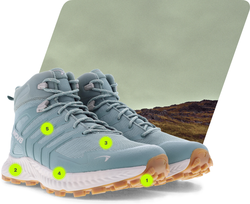 The fit of the ROCLITE MID hugs the natural contours of your foot, locking you in at the heel and then widening at the toes. This anatomical fit allows your feet to splay and feel the ground, while still giving you that secure feel that you need on technical trails.