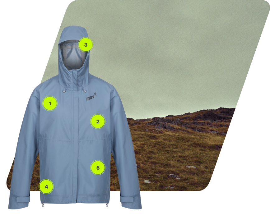 The Pertex Revolve fabric is highly waterproof, at 20,000 HH. It's also extremely breathable, allowing sweat to escape when you're working hard. An adjustable hood with wire-reinforced peak provides extra protection against the wind and the rain, and can be clipped down when not in use.