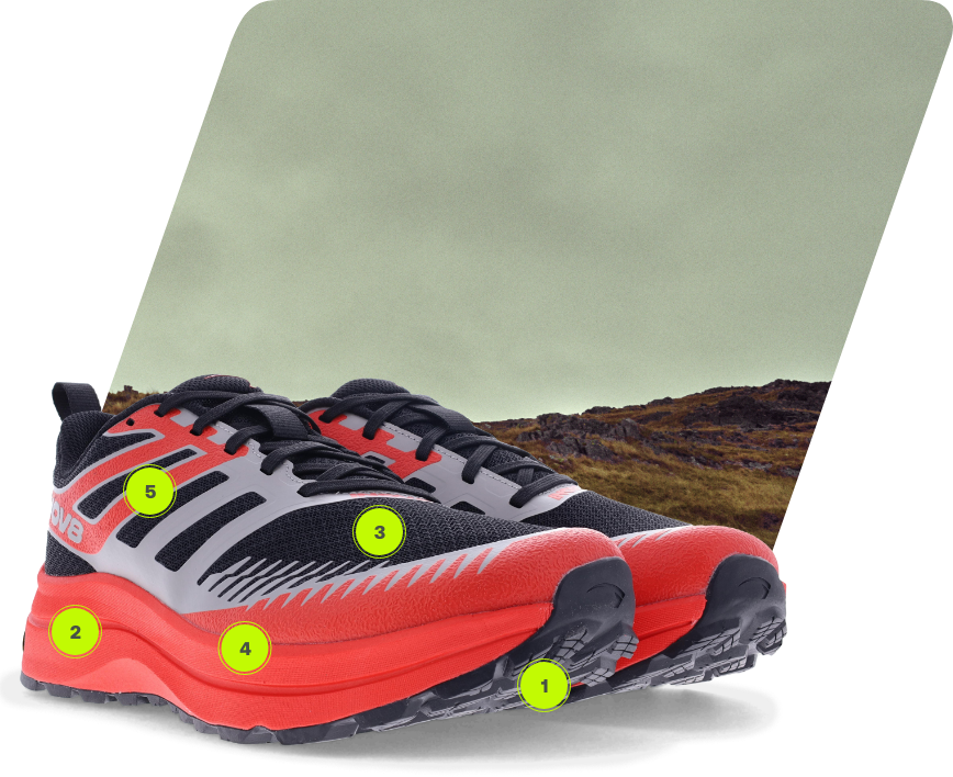 Hard-wearing, tacky rubber infused with the world’s strongest material – Graphene – covers the outsole. The 4mm long multi-directional lugs not only cut through loose trail and remain super-durable but also give improved grip in wet conditions. Underfoot flex grooves further enhance the agile, natural feel.